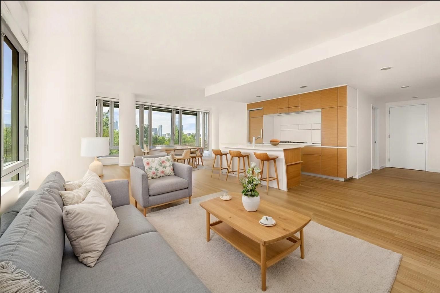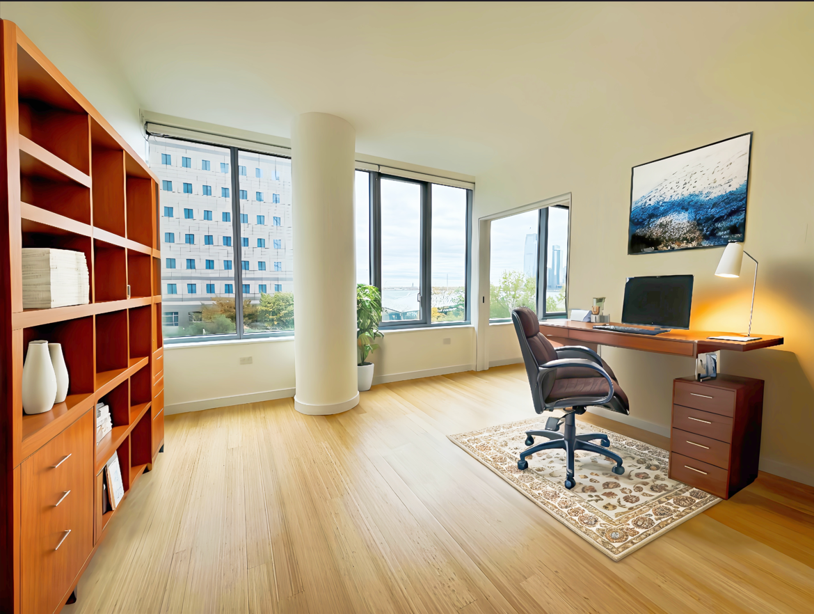 The unit has its own laundry room, and residents of this green building experience fresh, filtered air and water, as well as lower energy bills. The building has full amenities, including a health club, pool, kids' playroom, library, free gym, lounge, and garage.